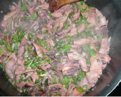 2. Dans un faitout, faire chauffer l’huile, ajouter les encornets et laisser cuire ½h sur feu moyen, en remuant de temps en temps.