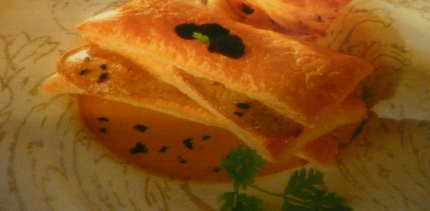 9. Pour servir, poser sur chaque assiette un rectangle de pâte recouvrir d’une escalope puis pâte, escalope et pâte. Verser la sauce d’un côté, poser un feuilleté de truffe de l’autre et servir.