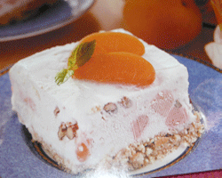4. La monter en chantilly, l’incorporer aux jaunes meringués. ajouter cerises et abricots macérés, amandes et pistaches écrasés, mélanger. tapisser un moule a cake de film alimentaire et y étaler la préparation. réserver 12 h au congélateur.